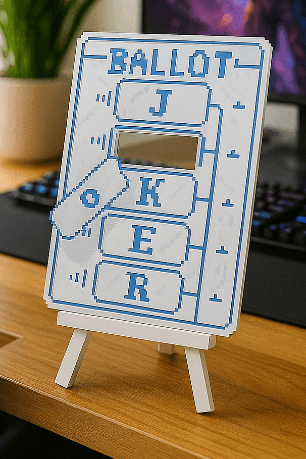 Nuestros cuadros de Jokers en PLA de origen vegetal llegan listos para colgar. Colores vivos, acabado limpio y peso ligero: perfectos para setups y paredes sin taladros complicados.