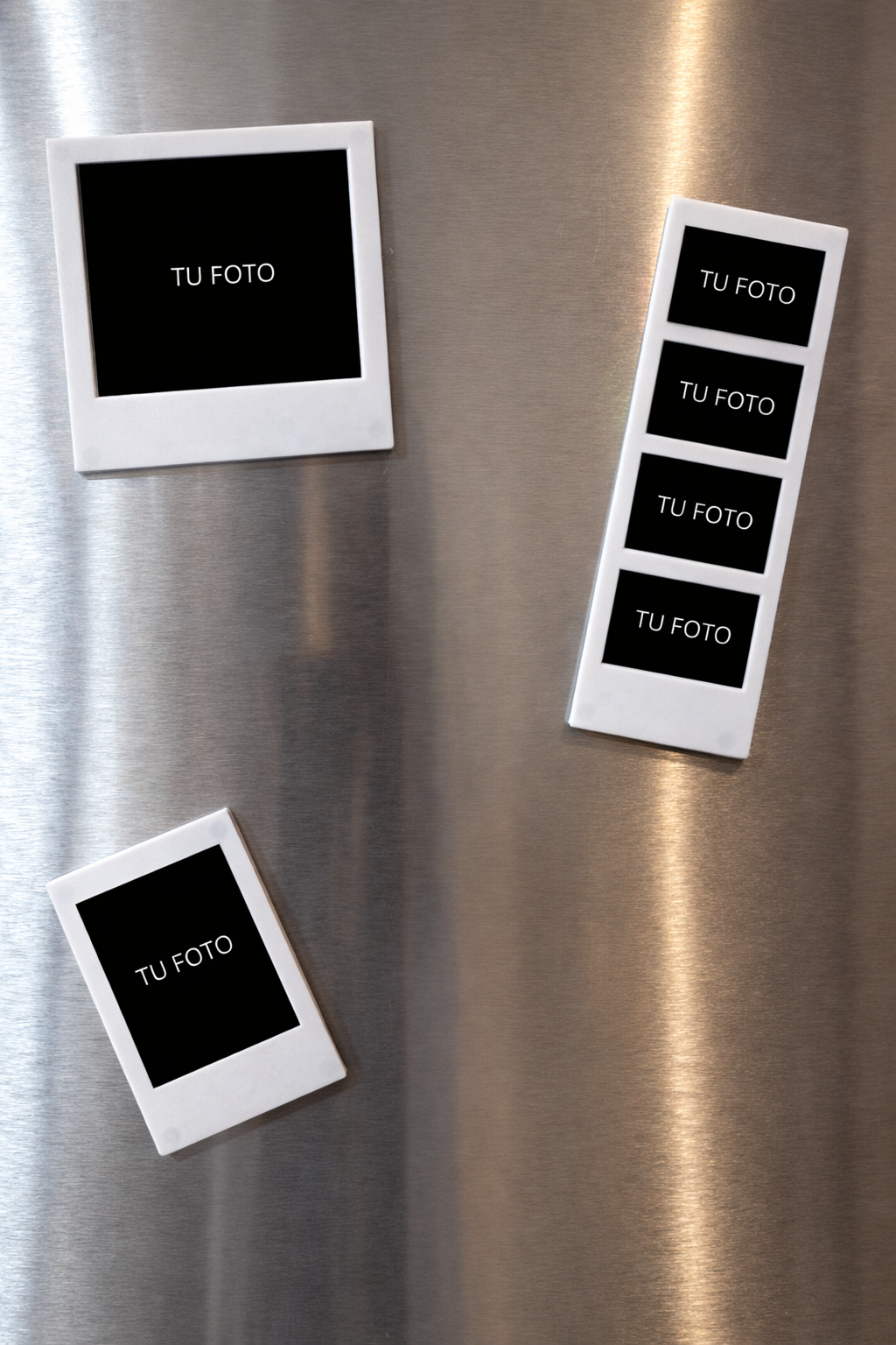 Imán decorativo con marco estilo instantáneo, personalizable con tus fotos favoritas.