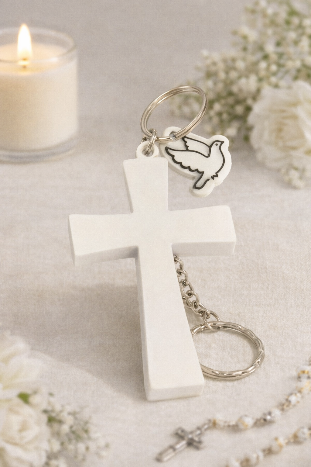 Este llavero personalizado está diseñado como recuerdo de bautizo, combinando símbolos religiosos clásicos con un formato práctico.