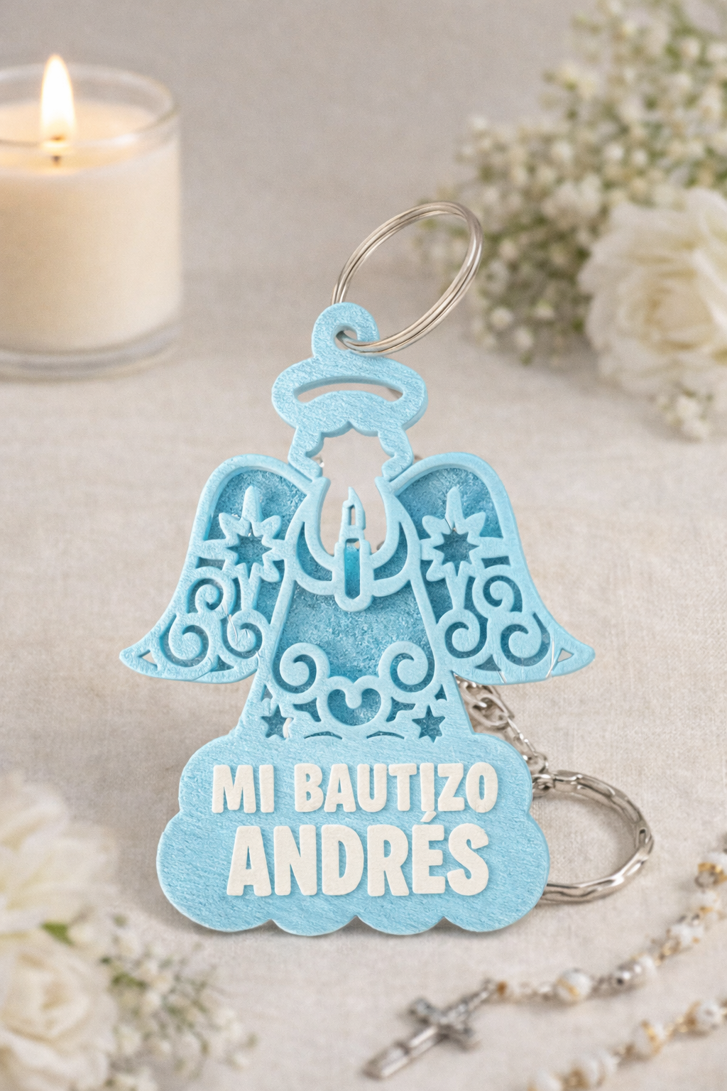 Llavero personalizado pensado como recuerdo de bautizo, con opción de incluir nombre y fecha para crear un detalle único.